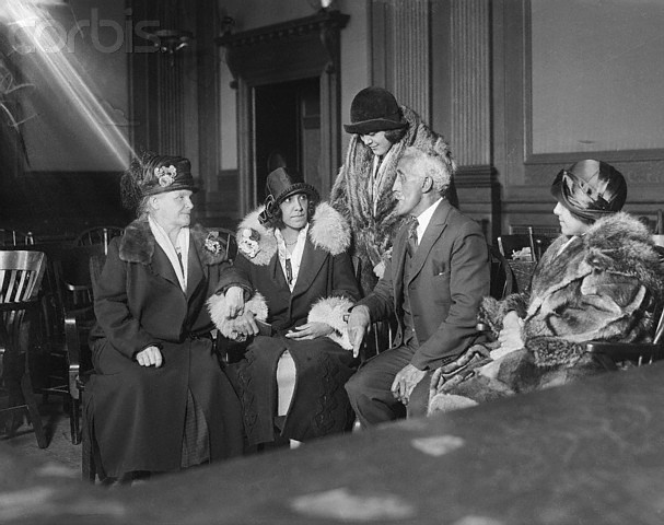 Original caption: Photo shows Mrs. Alice Rhinelander surrounded by relatives as jury decides case…Rhinelander jury locked for night; both sides anxiously await verdict. “Sentiment, passion, and prejudices should not interfere with your honest determination,” Justice Morschauser charged jury deciding Rhinelander case. Having failed to reach a verdict by 5:50 p.m. December 4th, they were ordered locked for the night. Left to right: Mrs. Jones, Alice, Grace, Jones, and Emily awaiting verdict.
